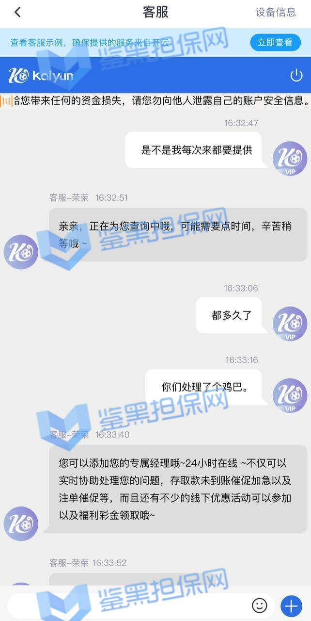 3、鉴黑维权专员联系开云相关负责人跟进该问题,对方一直让耐心等待,未积极联系第三方找打款人处理,也没有具体时间。