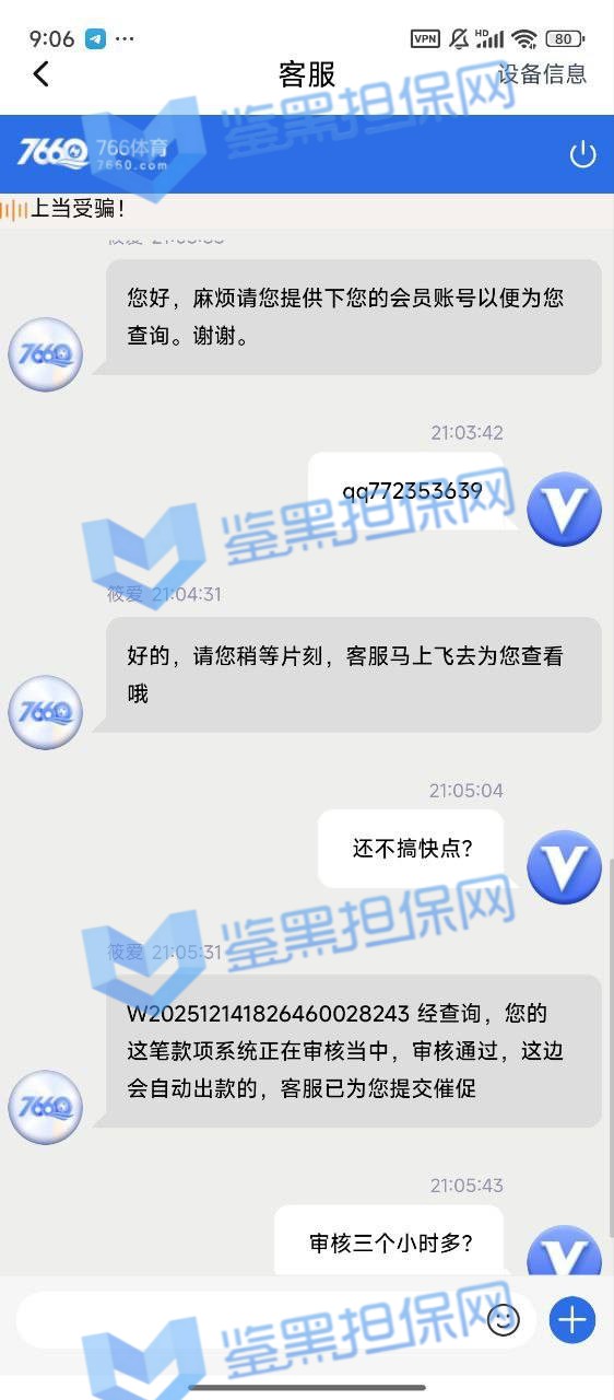2、鉴黑担保网维权专员了解到此会员在PA真人游戏里面投注,提款迟迟未到账,会员联系平台客服得到的回复是投注过程中存在违规行为,故扣除部分金额退回3400元后冻结账号。