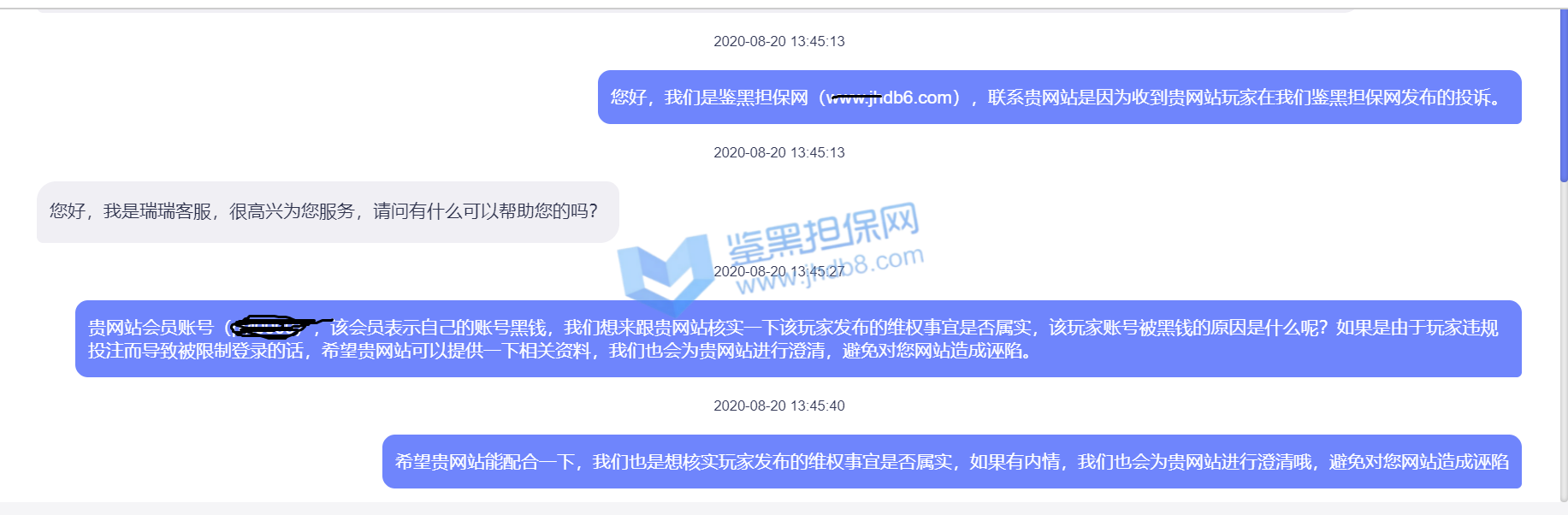 2.已受理的维权无法删除、撤销,鉴黑担保网将对维权事实进行核查验证并公开透明全过程,以保障维权双方的权益;