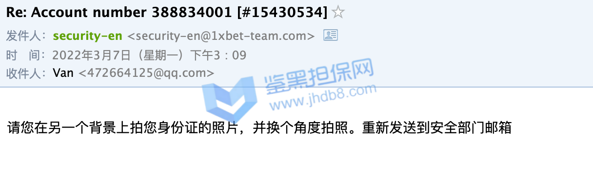 2022年3月1日我在1xbet充值了1万8的金额,想买各种比赛,到昨天3月7日,因为运气好,这个1万8的金额已经变成了6万元,我想取款,结果得到的消息是必须连续安全部分审核,我好奇为何注册的时候,存款的时候没有让我注册,但是也没多犹豫。随后就开始了一系列莫名其妙且扯皮的的过程。首先是一个说英文的客服回复我,让我提供银行流水证明,还必须是原件,带公章的,中国银行刚好可以开具这部分信息,我就提供了,然后让我提供身份证正反面,我也提供了,最奇葩的来了,让我把身份证放脸旁边拍一个自拍,带上他发我的那个邮件,这个有点过分了,但是我还是照着要求做了,随后他和我说资料审核结束,随后会有人联系我。我等了好久还是没有人联系我,我就主动发邮件询问,结果这次是个中文客服回复我,让我在不同的角度再拍一次身份证照片,我照做了,然后以文件大小不足1m为由让我重拍,我重拍之后,又换了个英文客服,说我提供的不是源文件,无法受理。我之后用不同角度/不同光线/甚至是扫描件发送我的身份证照片,都和我说不是他们要的文件,我随后发了我的护照照片,也是扫描件,一开始回复我要jpg照片文件,我发了以后,又回复我说不是他们要的文件了。这一系列过程下来让我觉得他们就是在刁难我,甚至是在骗取我的个人信息。希望鉴黑网可以帮我一下,帮我追款,谢谢。我的1xbet账号是388834001