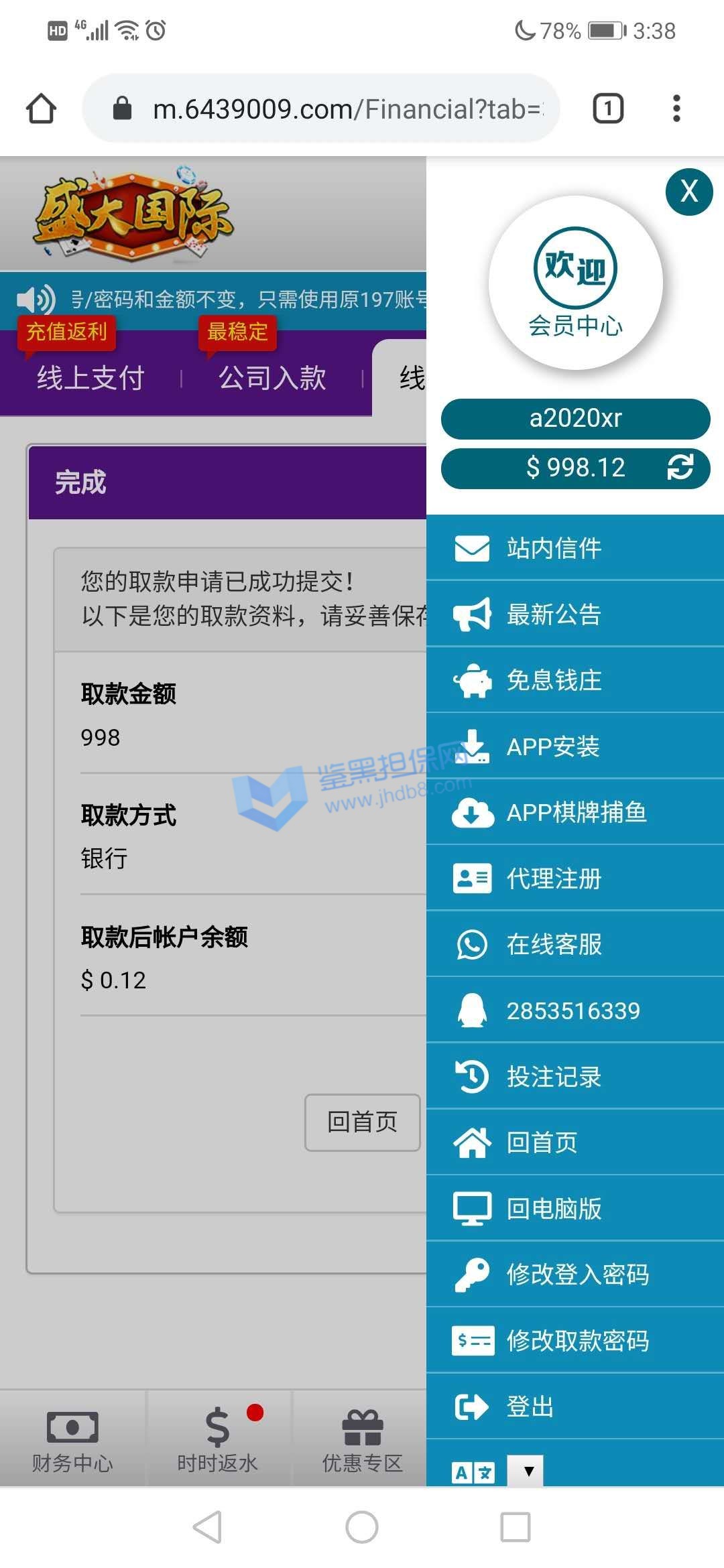 我是个线下低频彩庄家,主营线下福彩3D与体彩排列三的彩民投注,由于个人实力有限,每天会将一部分彩民投注打到盘上,本人保证所有注单都是真实彩民投注! 很早就有这家台子客服的微信,但没有尝试过投注,今年春节前,他家客服联系我,想合作,当时我明确表示低频彩由于玩法杂乱流水低赚钱慢,是一种在网上不受待见的彩种,但对方表示没关系,只要彩票站能买的,他那里都可以投注,于是就拿出了一部分投注到开心100了,也就发生了后面的不愉快! 4月4日晚,我正常投注,开奖后提款,很快就显示提款成功,但直到第二天都没有到账,客服以三方延迟为借口推脱,还诱骗我继续充值,但我没有继续上当,后来经过交涉,客服承认黑我钱,因为我赢了,他要降低损失,一共黑了我73360并注销了我的账号,希望大家擦亮眼睛,不要被这种黑台子诱惑,说的再多保障都没用,真黑你时候,你是找不到人的!另外要说明的是,由于低频彩封盘与投注时间非常紧张,所以本人经过与客服协商并得到他同意后申请了两个账号进行投注,不然忙不过来,每天我投注官方玩法,我员工投注传统彩玩法,绝非同平台对打套利,所有投注项目全部提前与客服协商过并得到了他的同意!恳请平台帮忙维权!