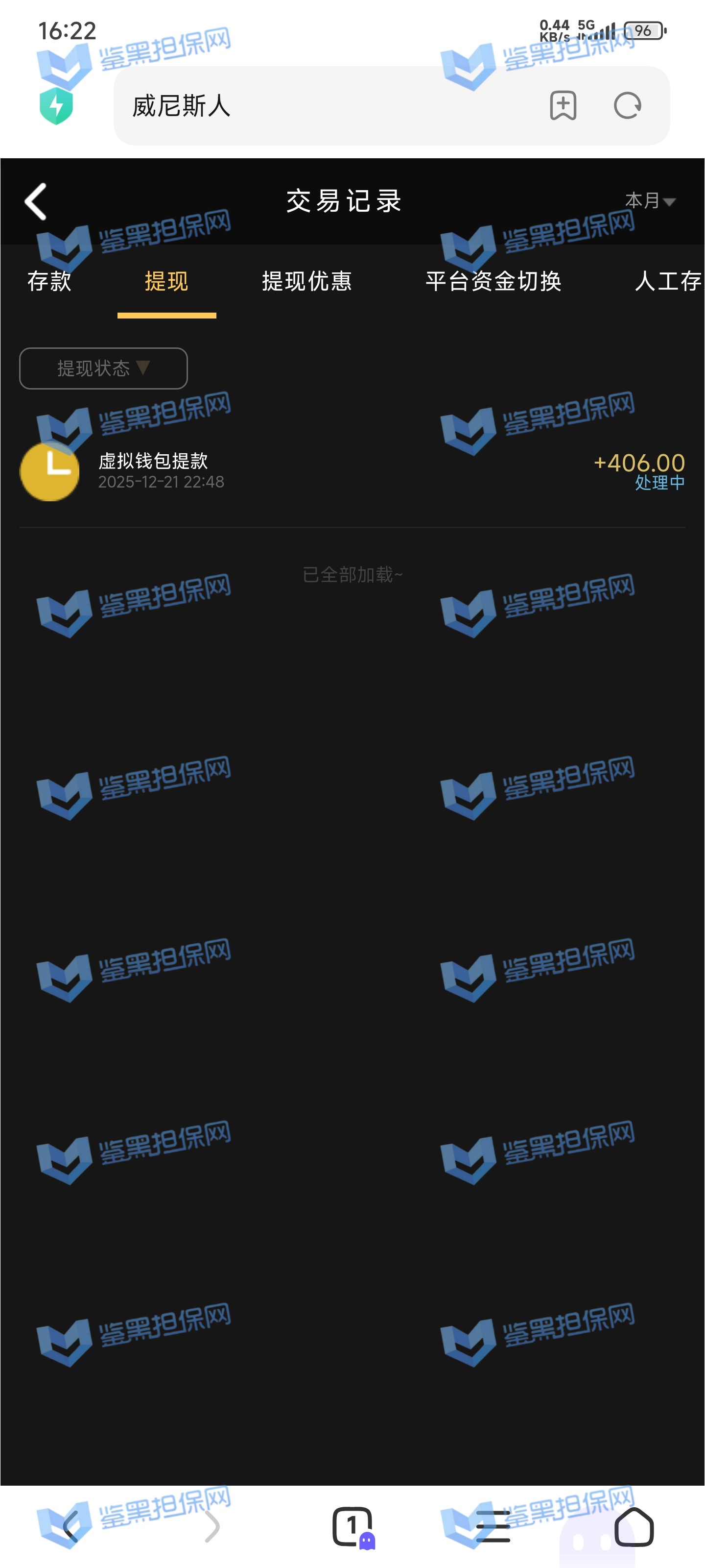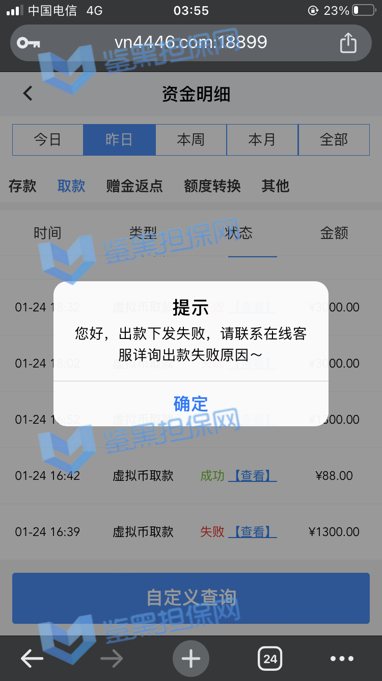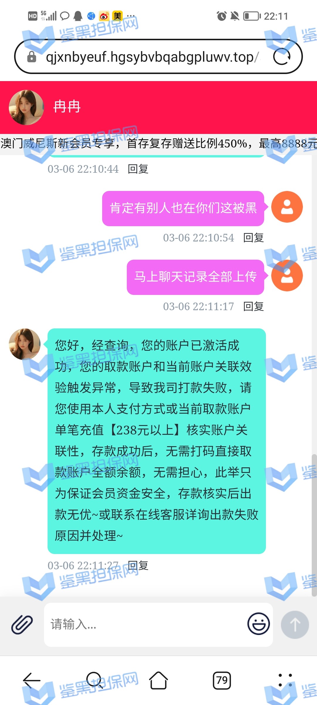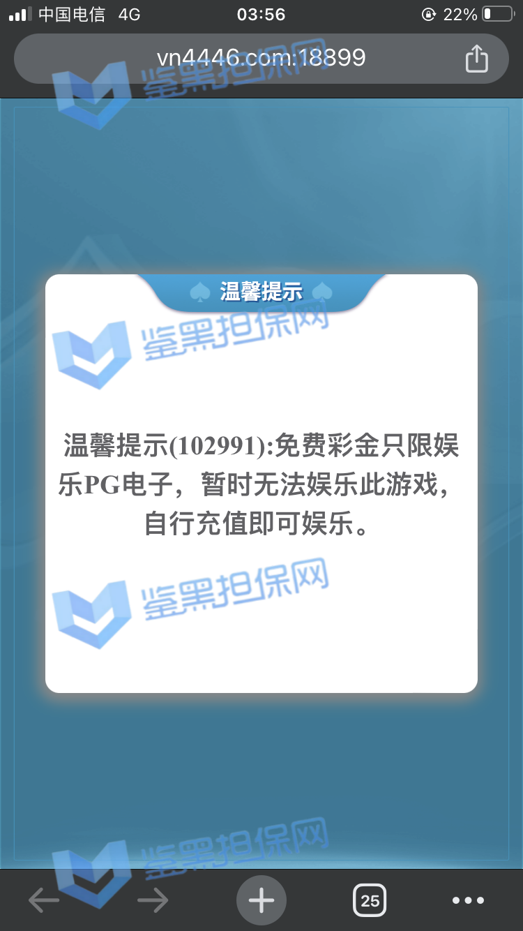 2025年1月23日下午我接到他们客服的电话邀请注册,说最高可以领288的彩金,我觉得这个平台不错挺大气的,就充了500元试试水。 因为他们平台我看是要求一倍流水提现,所以我就打到1300元申请了第一次提现,结果失败了,他们客服说让我打注册彩金288的5倍1440元才能提款,我就去他们指定的PG电子去打流水,当天晚上打够流水以后找他们提款再次失败,又改口说要打够提现余额的1300*5倍=6500元的流水才能提现。从第二次给我退回来以后他们给我后台修改了PG电子的赔率,损失从15%提高到50%,我一算账根本不够,然后我就又去打了百家乐,想着输完就不提,赢了就去刷流水,也是运气好,从1300元梭哈到5000多元,回来刷了一晚上的PG电子,一直到1月24日的中午,才刷够流水。1月23日刷了2000多流水亏了300多,差不多15%的亏损,第二天刷了4000多亏损超过2300元,我也没说什么,想着打够就提现吧。然后1月24日我去申请提现,客服先给我提了个88元,然后再提的时候以不足vip1为由让我继续充值700元到vip1,我又充了700,然后又去申请提现,提现后又给我拒绝了,说要我再充值1000元才能使用钱包收款,这回已经引起我的警觉了,我就和他们客服再三确认,这回充1000一定没问题了吧!他们客服拍着胸脯说百分之百一定能提现,给我保证,我就又充了一千。冲进去以后我申请提现又失败了,理由是资金风控让我再充值余额一半的钱也就是4000多元解除风控(我的资金是工资卡没有任何问题),他们客服就变成了复读机,一直让我继续充值,我说什么都没用,我说刚才不是百分之百能提现成功吗?他们也不理我,说这次百分之百能提成功。所以他们平台是输了钱算我倒霉,赢了钱就开始连环套路骗钱的骗子平台 以下是我经过技术手段查到的该平台的所有域名(我本人是计算机科班出身) 威尼斯人: wn88.vip vn600.top vn601.top vn602.top vn603.top vn604.top vn605.top vn606.top vn607.top vn608.top vn609.top vn610.top wn880.top wn881.top wn882.top wn883.top wn884.top wn885.top wn886.top wn887.top wn888.top wn889.top wn890.top wn891.top wn892.top wn893.top wn894.top wn895.top wn896.top wn897.top wn898.top wn899.top vn4456.com vn4457.com 81157.cc 元大娱乐城(同一个主体运营的另一家平台): yd7575.com yd9568.com yd3637.com yd3690.com yd5748.com yd9928.com yd3657.com yd2234.com yd1238.com yd1239.com yd1237.com yd2235.com yd1230.com yd1236.com yd1235.com