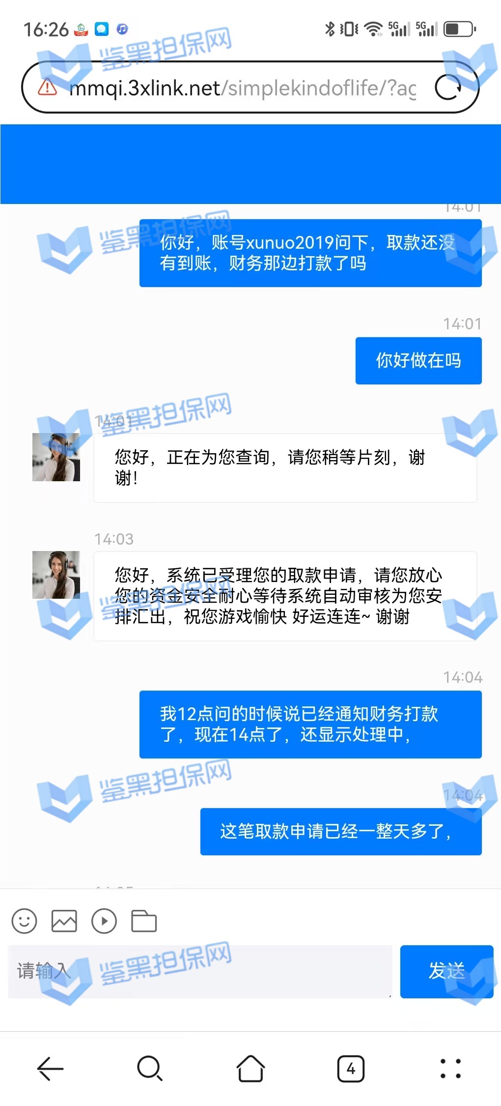 2、该会员多次联系平台追问提款到账情况,多次被在线客服以财务部门受理中,需要耐心等待到账成功,24小时还是未到账成功。
