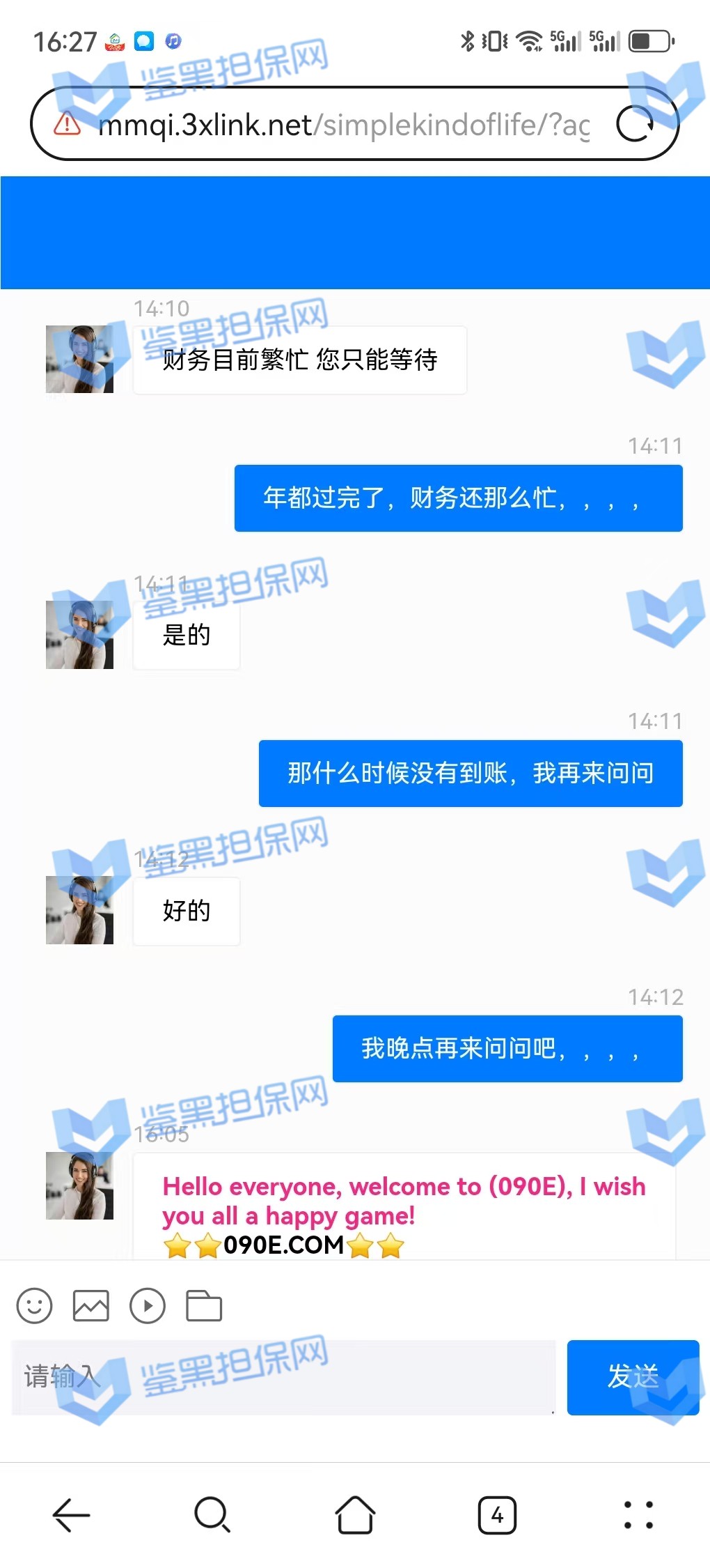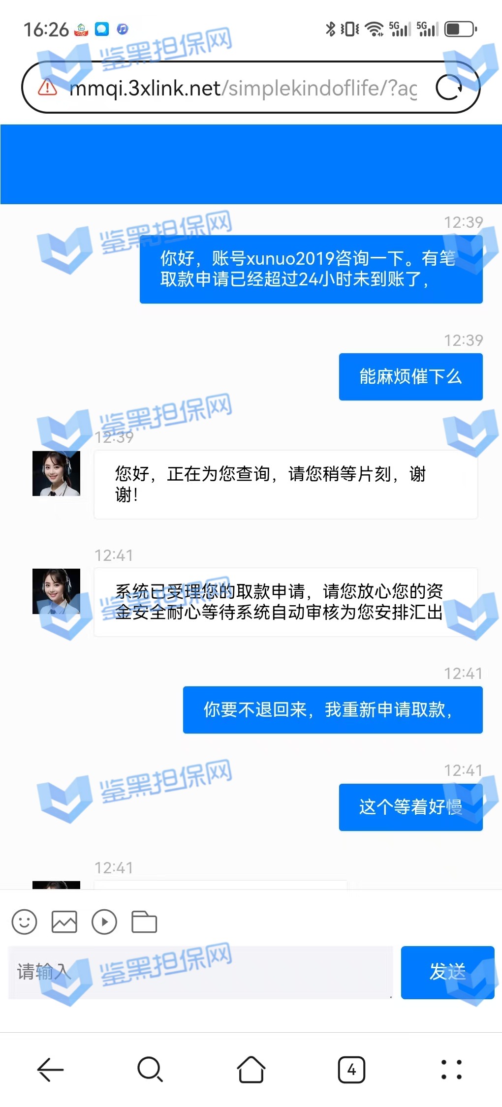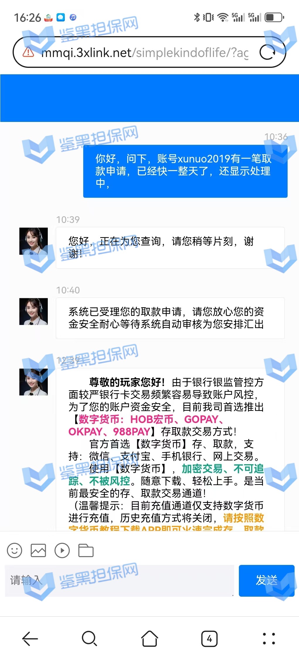 3、鉴黑担保网维权专员联系该平台核实情况,相关负责人表示财务繁忙,出款用户较多,需要依次处理,但是已过去2天时间且网站也没有发布提款繁忙公告通知玩家,维权专员沟通后要求尽快出款,对方表示会尽快处理。