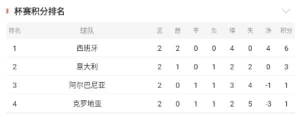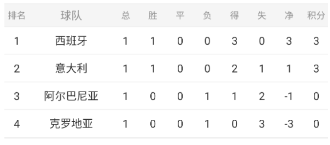 B组:西班牙、克罗地亚、意大利、阿尔巴尼亚;