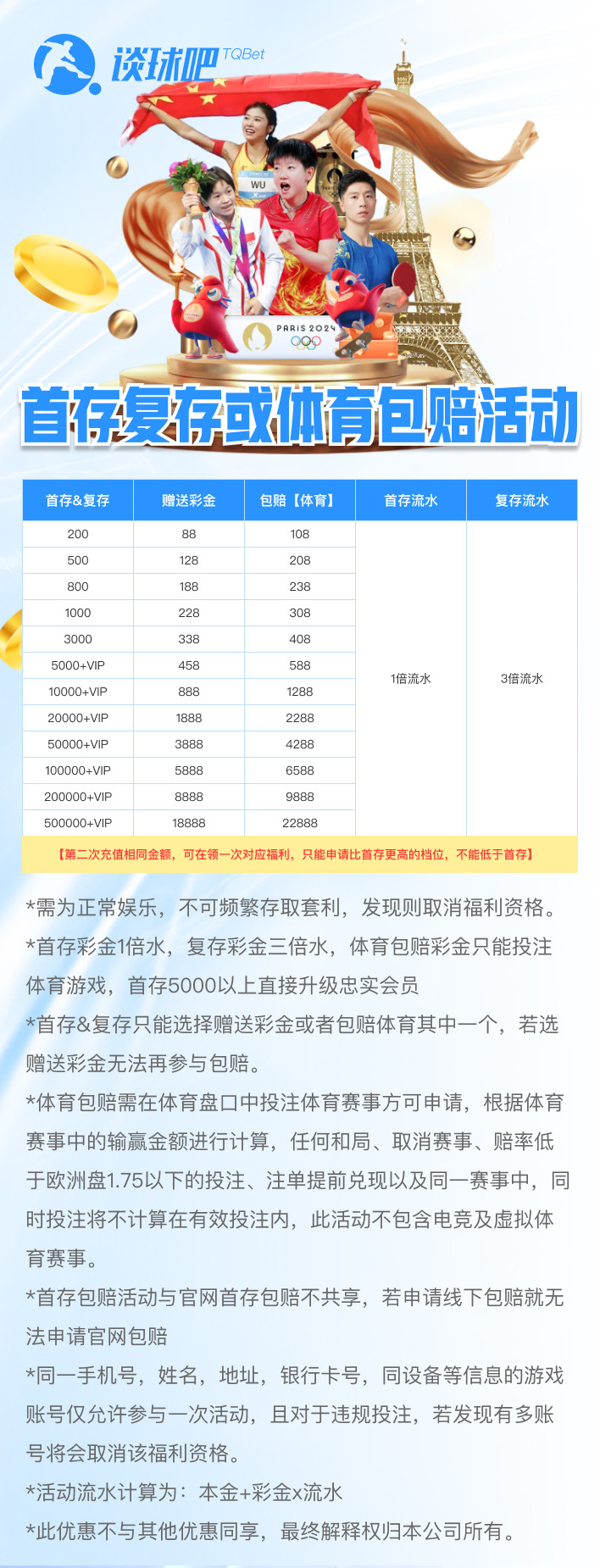 3.体育/电竞游戏有效投注仅对已结算并产生输赢结果的注单进行计算,任何走盘,取消赛事将不计算在有效投注, 体育不能参加赔率低于欧洲盘1.75、 香港盘0.75、马来盘0.75的投注赛事。(例如:下注100元,香港盘赔率0.2,如赢派彩20元,有效投注为20元;如输本金100元,有效投注额为100元)